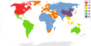 Weltkarte, die die Verteilung der sechs existierenden Regionalcodes darstellt, die auf DVD-Video eingesetzt werden.